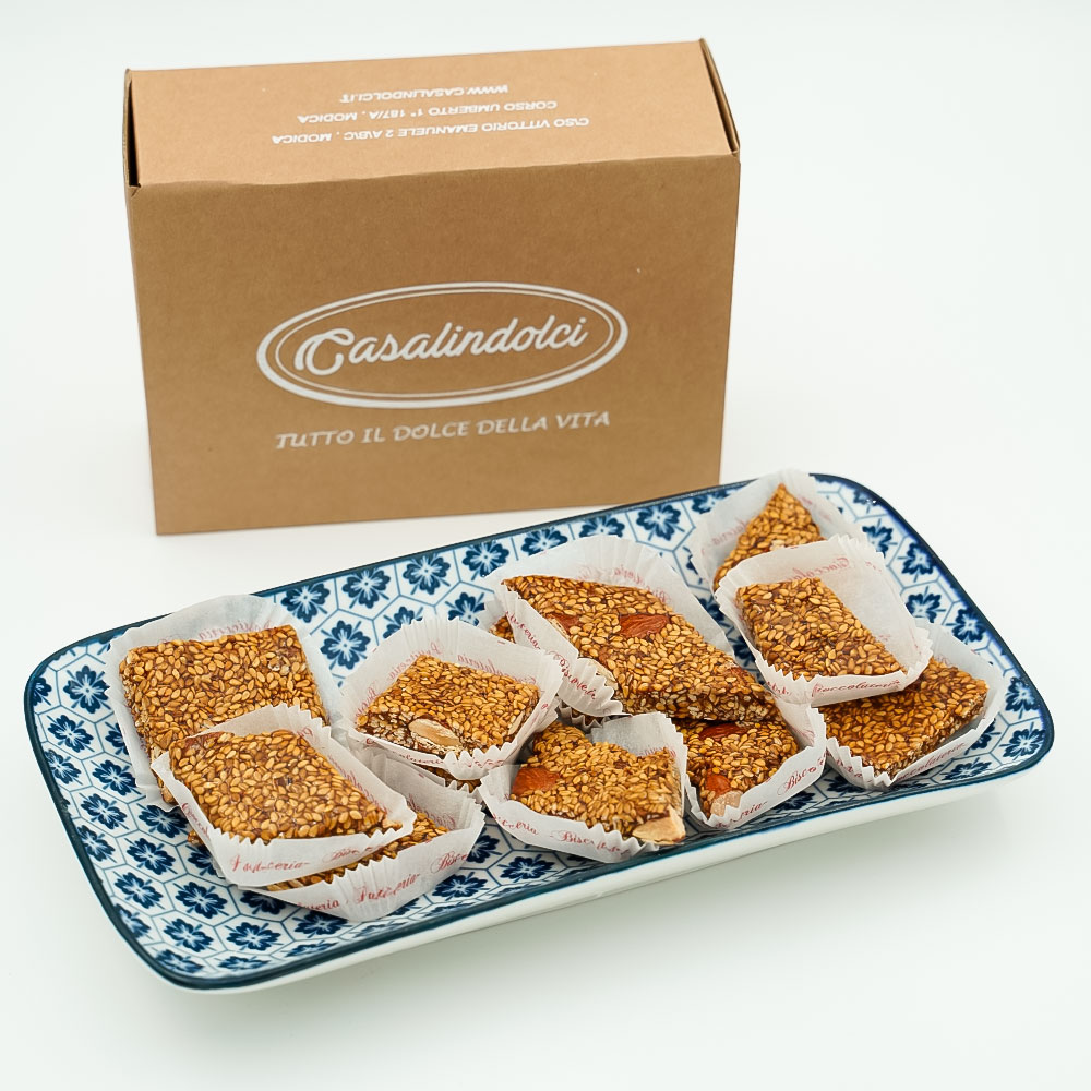 Semi di sesamo tostati e caramellati lavorati con cura da mani esperte. Una barretta croccante da mordere, un gusto unico da far sciogliere in bocca.